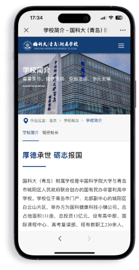 國科大(青島)附屬學校是中國科學院大學與青島市城陽區人民政府聯合創辦的國有民辦非營利高中學校。學校位于青島市門戶、北部副中心的城陽區白云山片區,舉辦方為國科健康科技小鎮公司。總占地面積131畝,總投資13億元,設有高中部、國際課程中心、高考復讀部,現有教職工230余人,學生近2200余人。